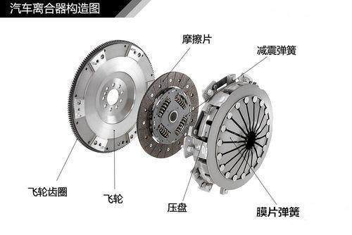 我們能看到離合器的位置就是在發(fā)動(dòng)機(jī)和變速器這兩者之間的,簡(jiǎn)單的說就是離合器的一端是連著發(fā)動(dòng)機(jī)的,另外一端是連著變速器的。它的組成部分分為:主動(dòng)部分(飛輪、離合器蓋等)、從動(dòng)部分(摩擦片)、壓緊機(jī)構(gòu)(膜片彈簧)和操縱機(jī)構(gòu)(離合器踏板)。如圖